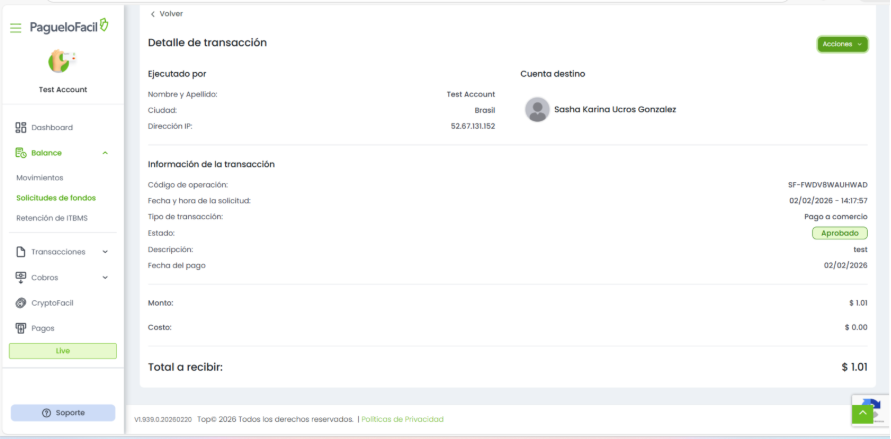 Se abrirá una vista con el detalle completo de la transacción, donde podrás ver:
