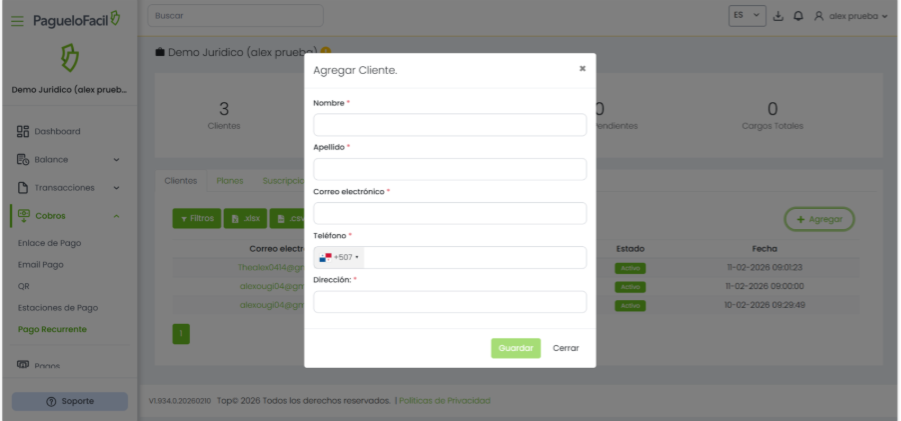 Esta guía te permite crear y gestionar clientes en la sección de cargos recurrentes de PagueloFacil, facilitando la administración de suscripciones, pagos automáticos y el seguimiento de cargos dentro de la plataforma.