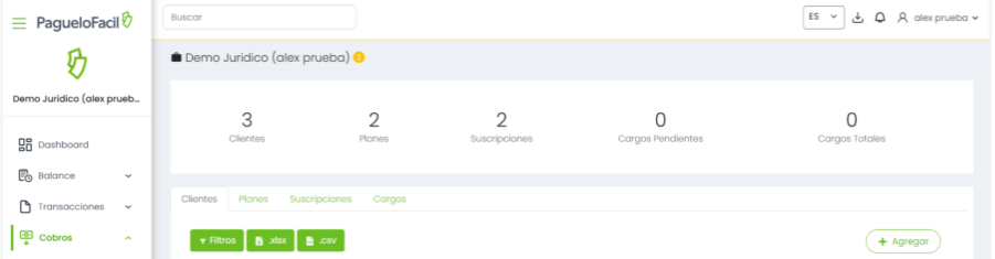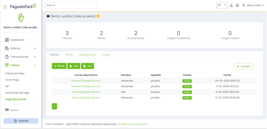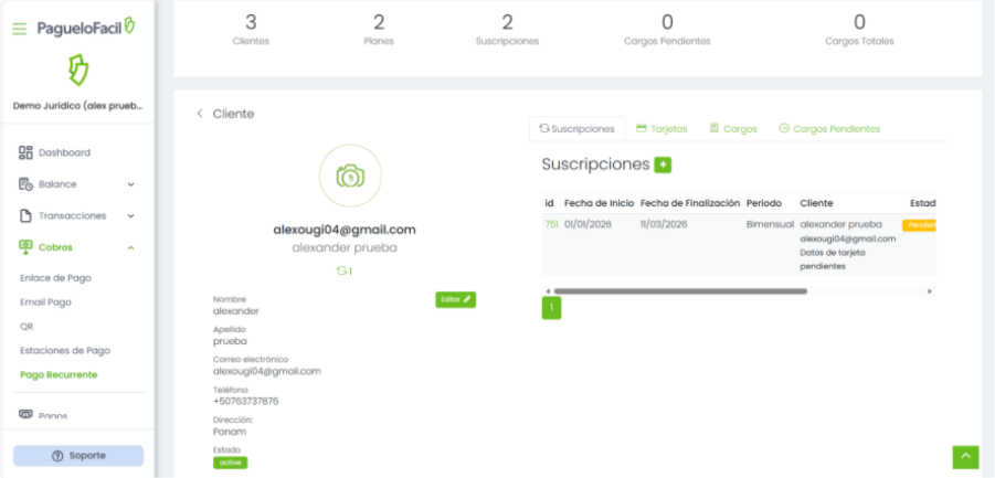 Listo. El cliente quedará creado y disponible para gestionar suscripciones, pagos automáticos e historial de cargos dentro de la plataforma.