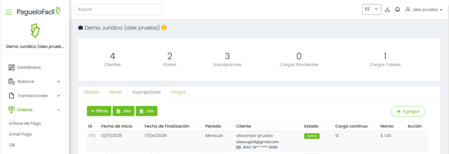 Listo. La suscripción ha sido creada correctamente y los cargos se ejecutarán según la configuración establecida.