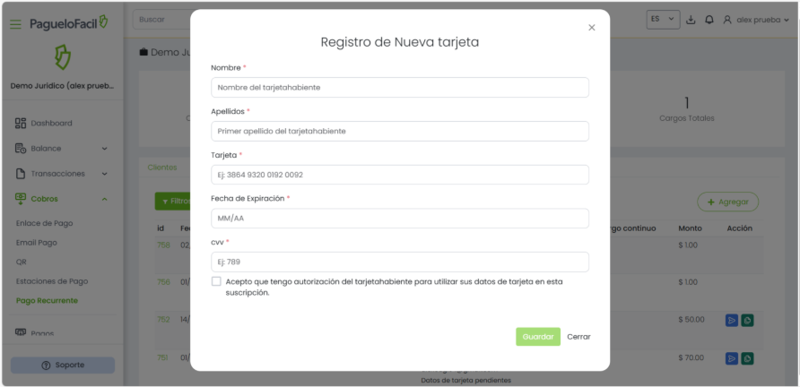 Esta guía te permite crear y gestionar clientes en la sección de cargos recurrentes de PagueloFacil, facilitando la administración de suscripciones, pagos automáticos y el seguimiento de cargos dentro de la plataforma. 1. Iniciar sesión Ingresa a tu ...