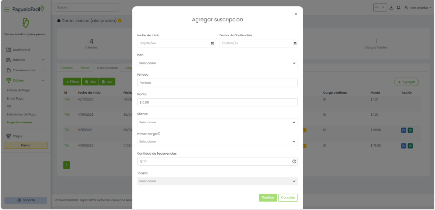 Fecha de Finalización: Fecha en la que finalizará la suscripción (opcional según el caso).