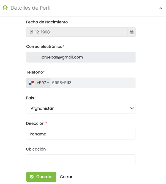 4. Se habilitarán los campos de País, Dirección y Ubicación. Una vez editados los campos, toca en el botón de guardar.