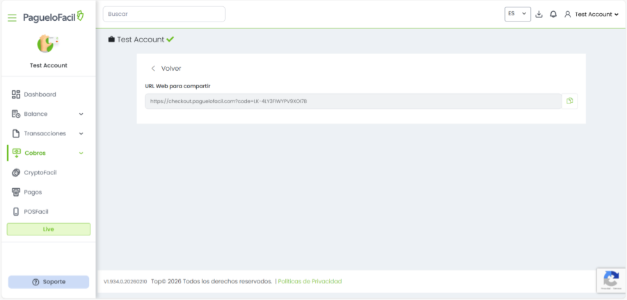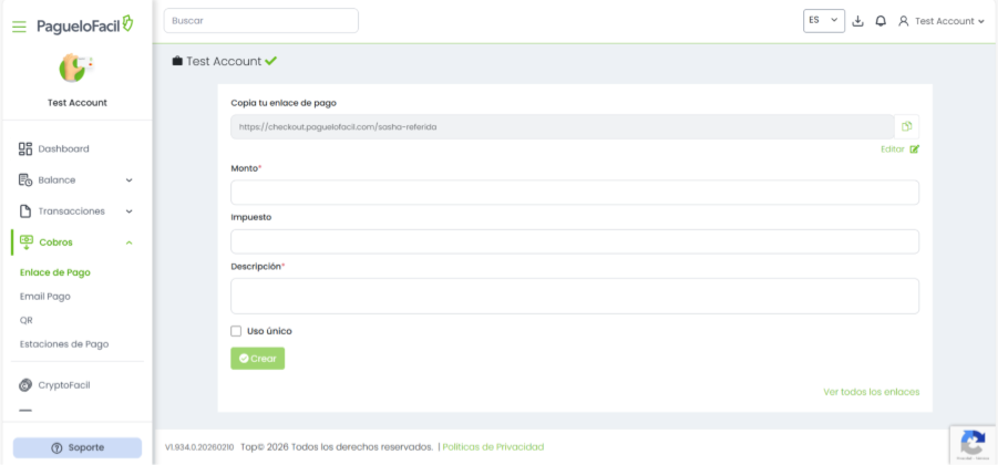 El sistema generará automáticamente el Enlace de Pago, el cual podrás copiar y compartir con tus clientes.