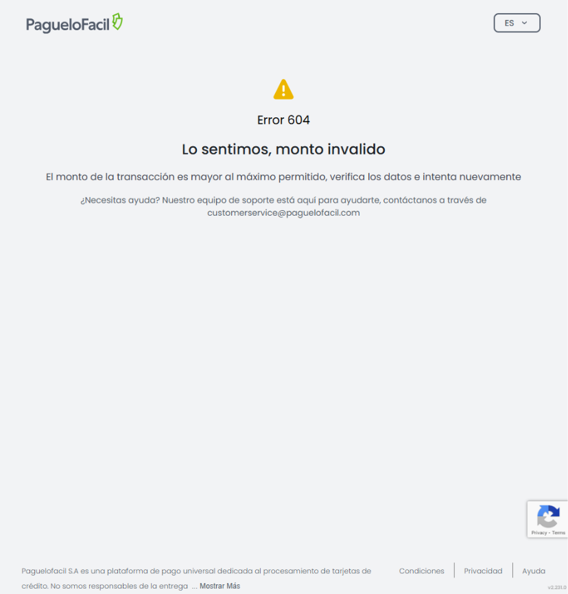 Esta guía detalla el error 604, el cual ocurre cuando el valor de la transacción excede los límites máximos establecidos por la plataforma de PagueloFacil.