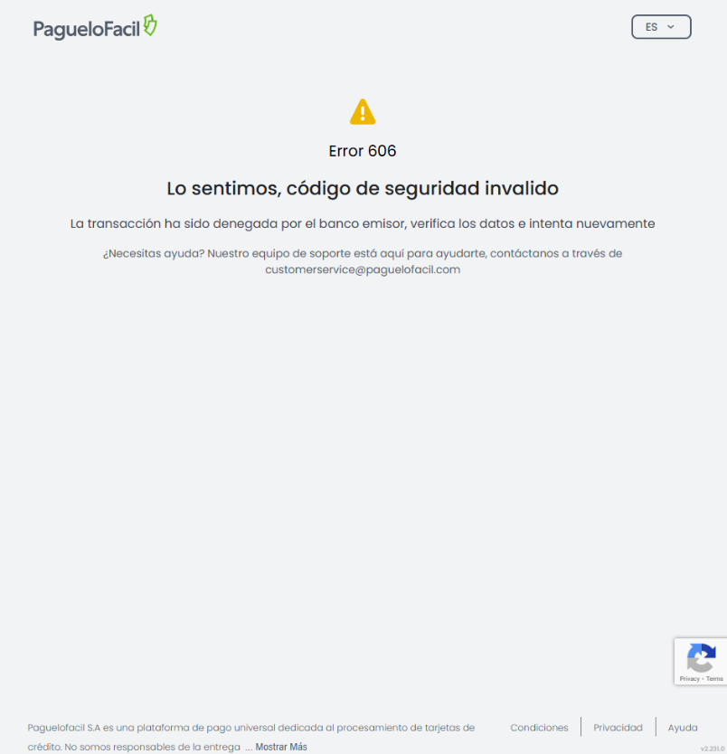 Esta guía detalla el error 606, el cual se produce cuando el código de verificación (CVV/CVC) ingresado no coincide con los registros del banco emisor de la tarjeta.