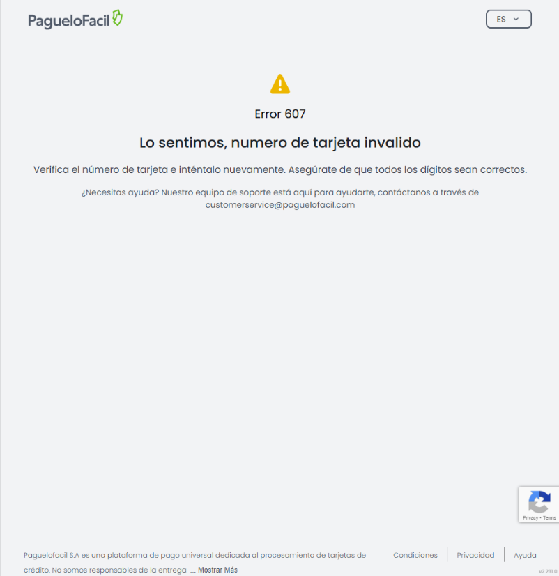 Error 607 – Número de tarjeta inválido