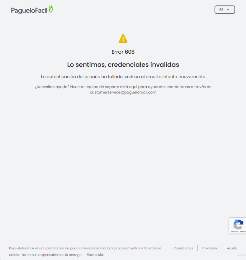 Contactar a Soporte: Si estás seguro de que tus datos son correctos y el error persiste, contacta a customerservice@paguelofacil.com para verificar el estado de tu cuenta de usuario.