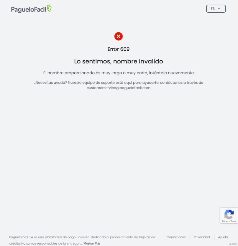 Esta guía detalla el error 609, el cual se presenta cuando el nombre del titular de la tarjeta ingresado no cumple con los requisitos de longitud o formato permitidos por la pasarela de pagos de PagueloFacil.