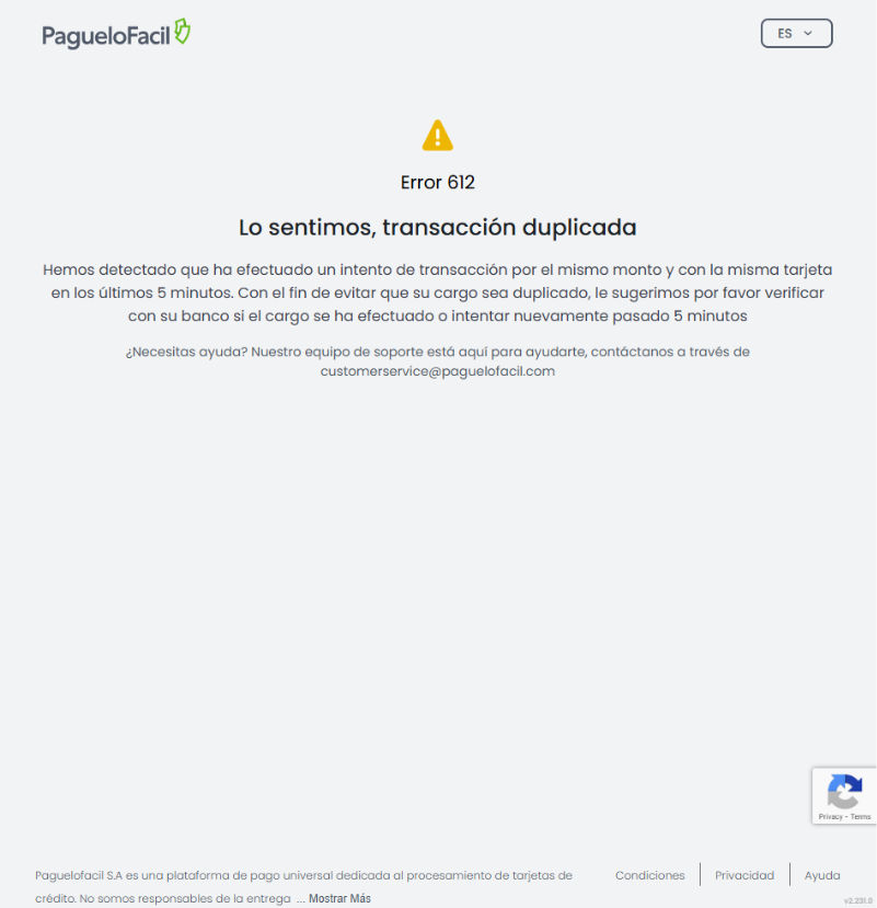 Esta guía detalla el Error 612, una medida de seguridad de PagueloFacil diseñada para evitar que se realicen cobros múltiples por accidente cuando se detectan intentos de pago idénticos en un periodo corto de tiempo.