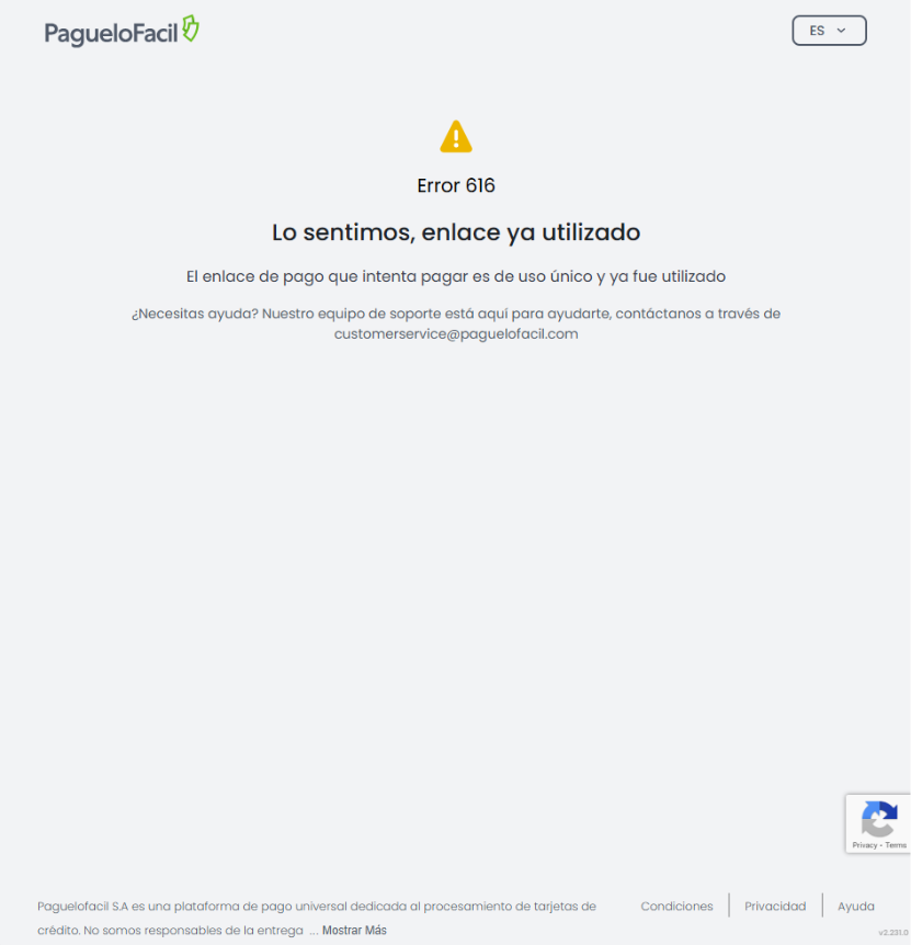 Esta guía explica el error 616, una validación de seguridad de PagueloFacil que se activa cuando se intenta procesar un pago a través de un enlace de uso único que ya ha completado su ciclo de vida.