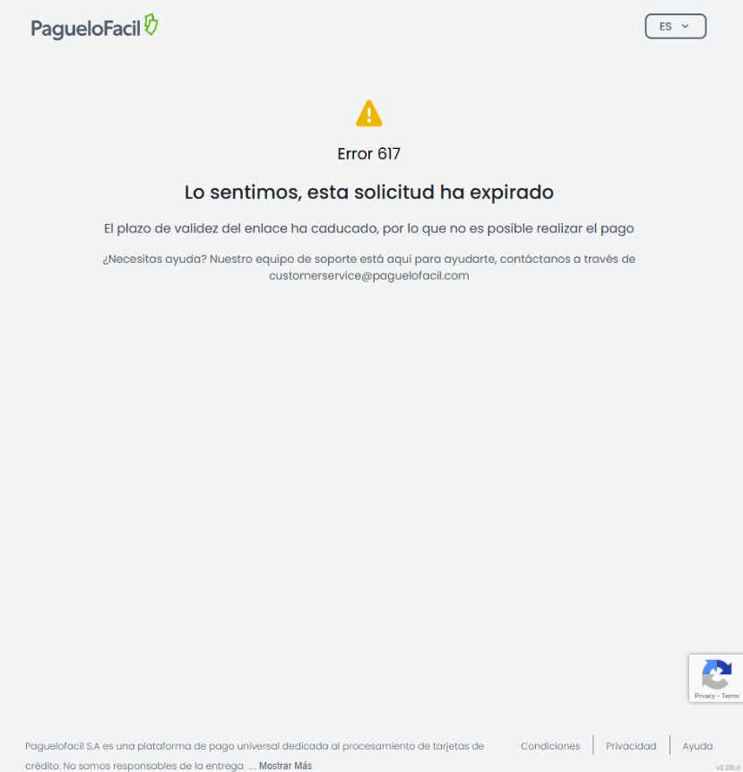 Esta guía detalla el error 617, una validación temporal de PagueloFacil que se activa cuando un enlace de pago ha superado su tiempo de vida útil configurado por el comercio.