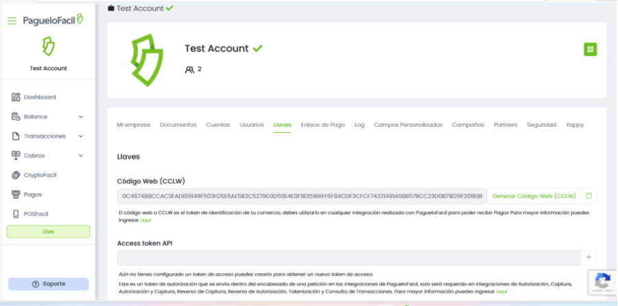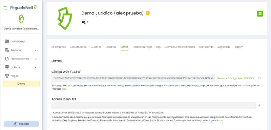 Esta guía te permite acceder y gestionar tus llaves de integración en PagueloFacil en ambientes LIVE y DEMO. Podrás identificar el ambiente en uso y utilizar las llaves según tu necesidad para configurar o probar tus servicios.